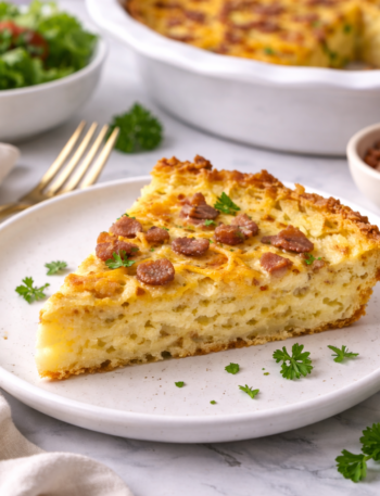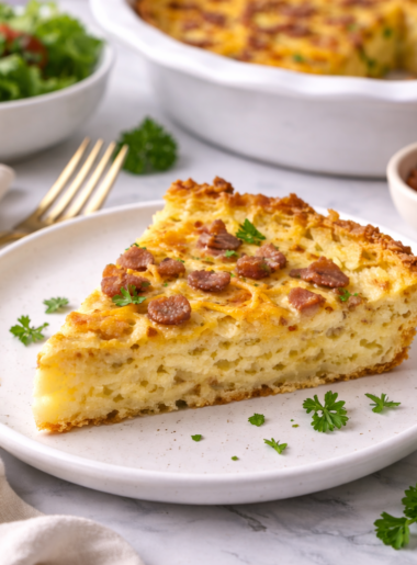 Bacon & Cheese Potato Crust Quiche with crispy potatoes, creamy eggs, and savory bacon. An easy brunch recipe packed with …