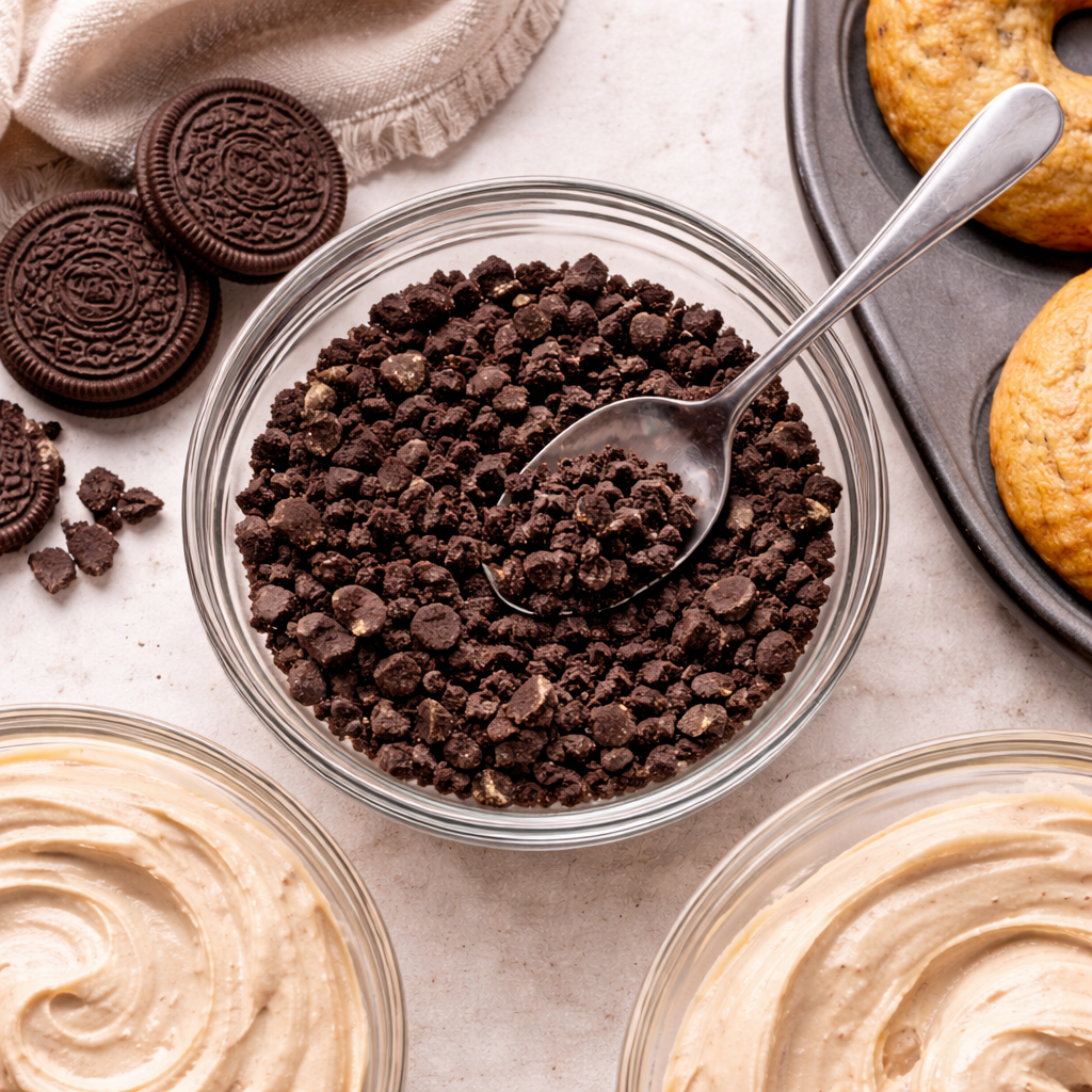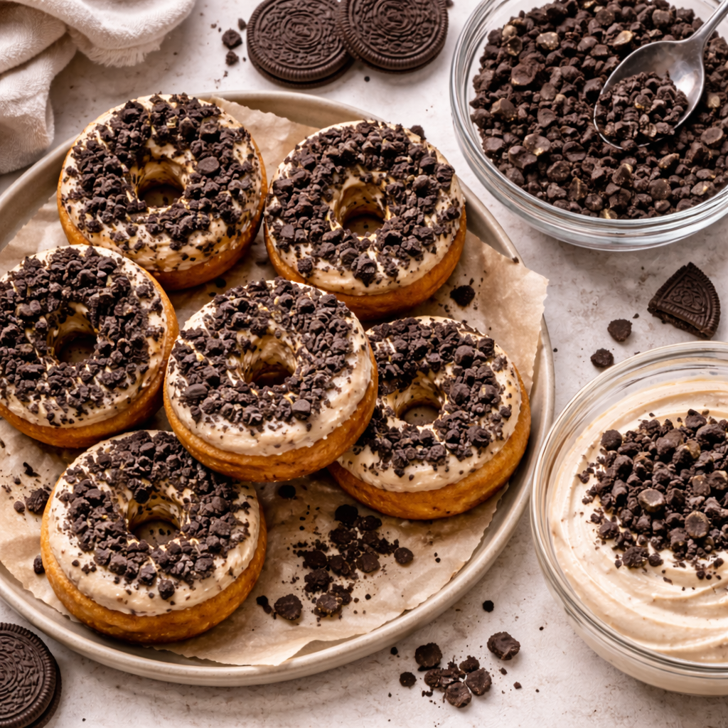 Serve donuts with tiramisu dip on the side for dipping or spoon dip over the top. Sprinkle generously with Oreo crumble before serving.