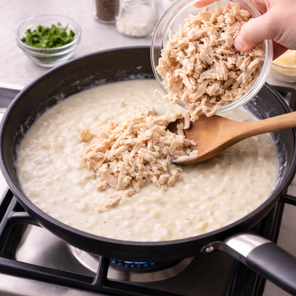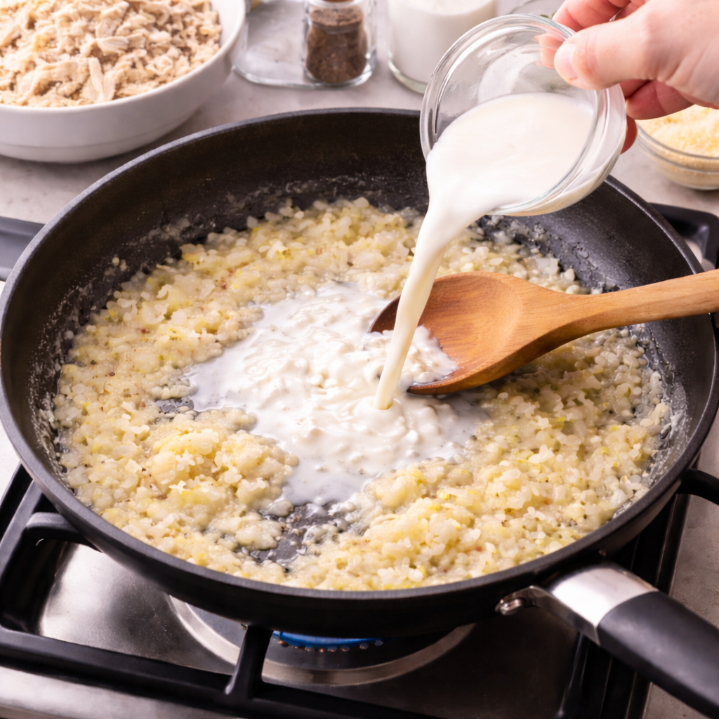 Slowly pour in milk while stirring constantly until a thick and creamy sauce forms.