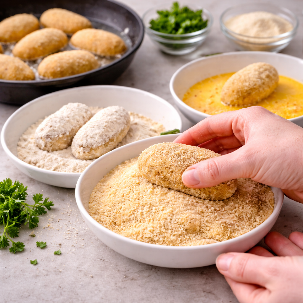 Roll each croquette in flour, dip in beaten eggs, coat with breadcrumbs, then fry in hot oil until golden brown and crispy.