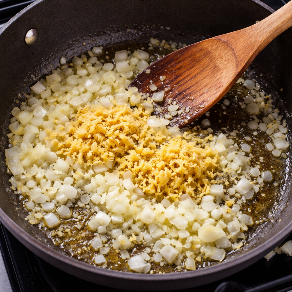 Heat cooking oil in a pan over medium heat then sauté onion garlic and ginger until fragrant.