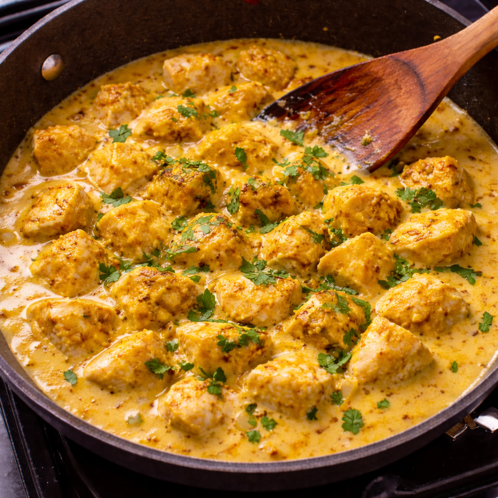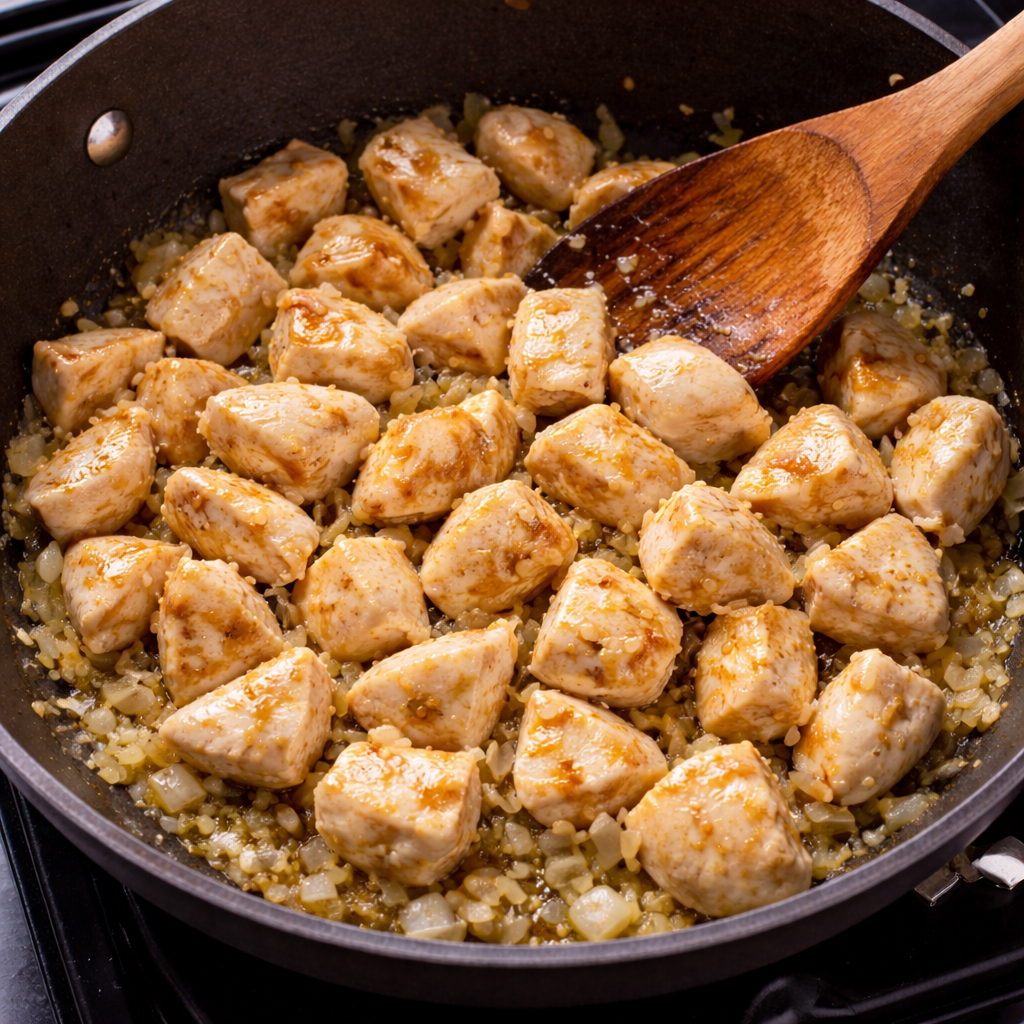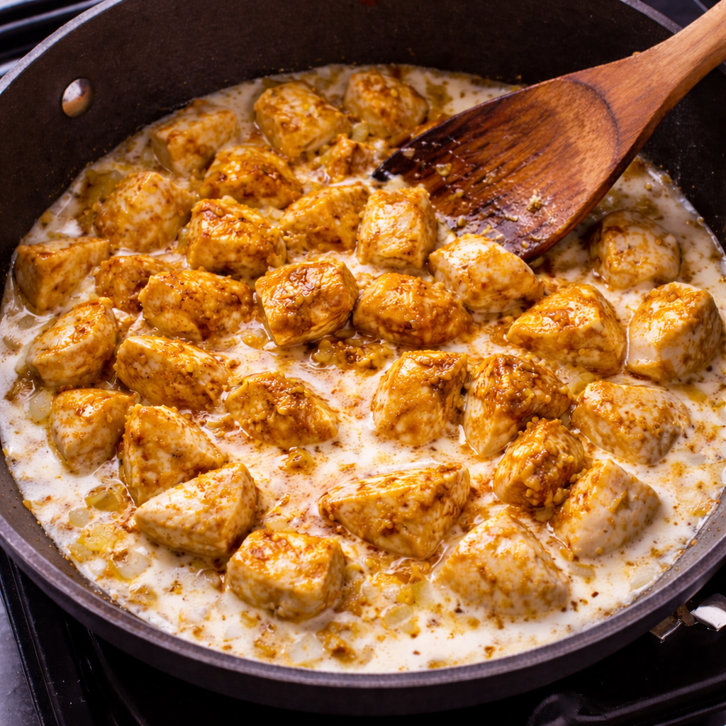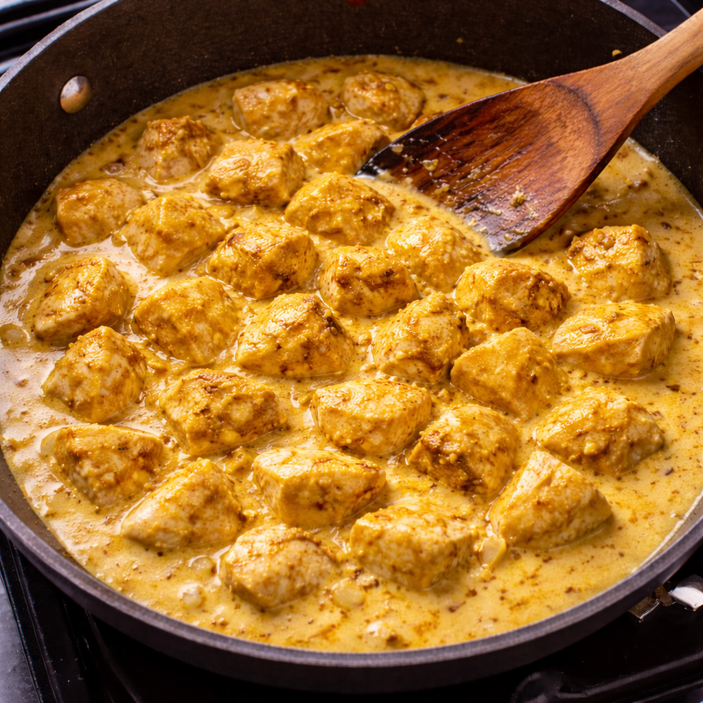 Simmer on low heat until chicken is fully cooked and sauce thickens.