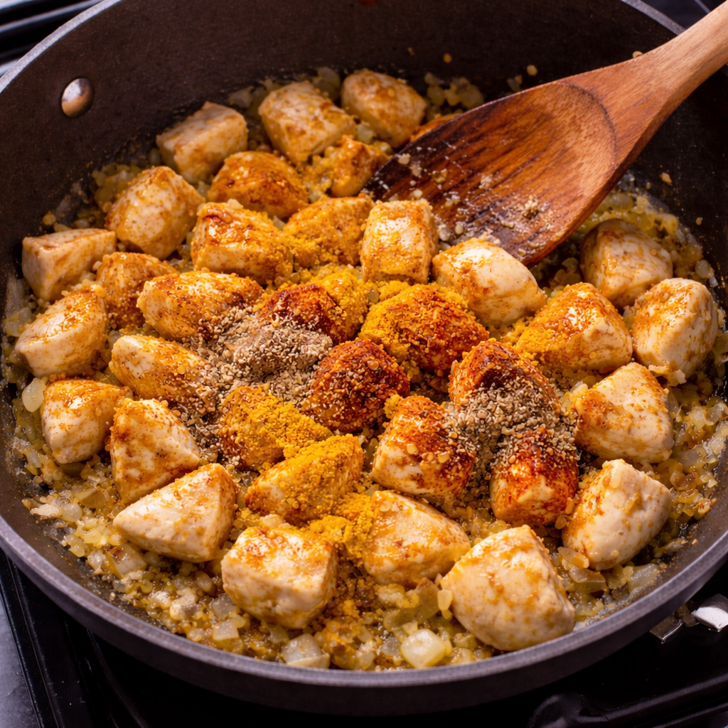 Stir in curry powder turmeric paprika salt and black pepper evenly.