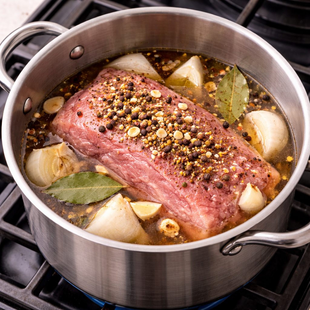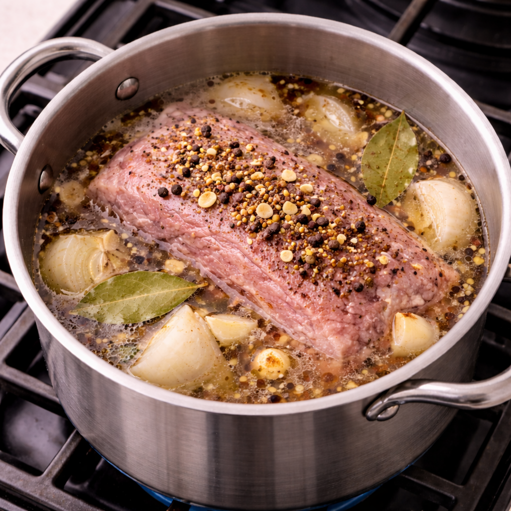 Place the beef brisket in a large pot. Add beef broth or water until the meat is mostly covered. Add onion, garlic, pickling spice, bay leaves, and peppercorns.