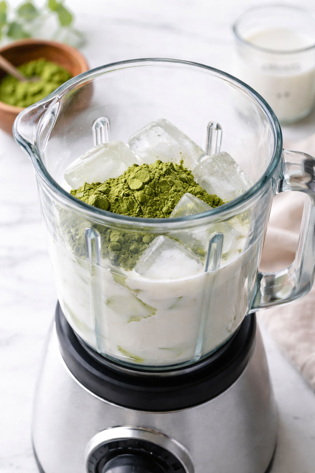 Rinse the blender and add matcha powder, remaining almond milk, and ice.