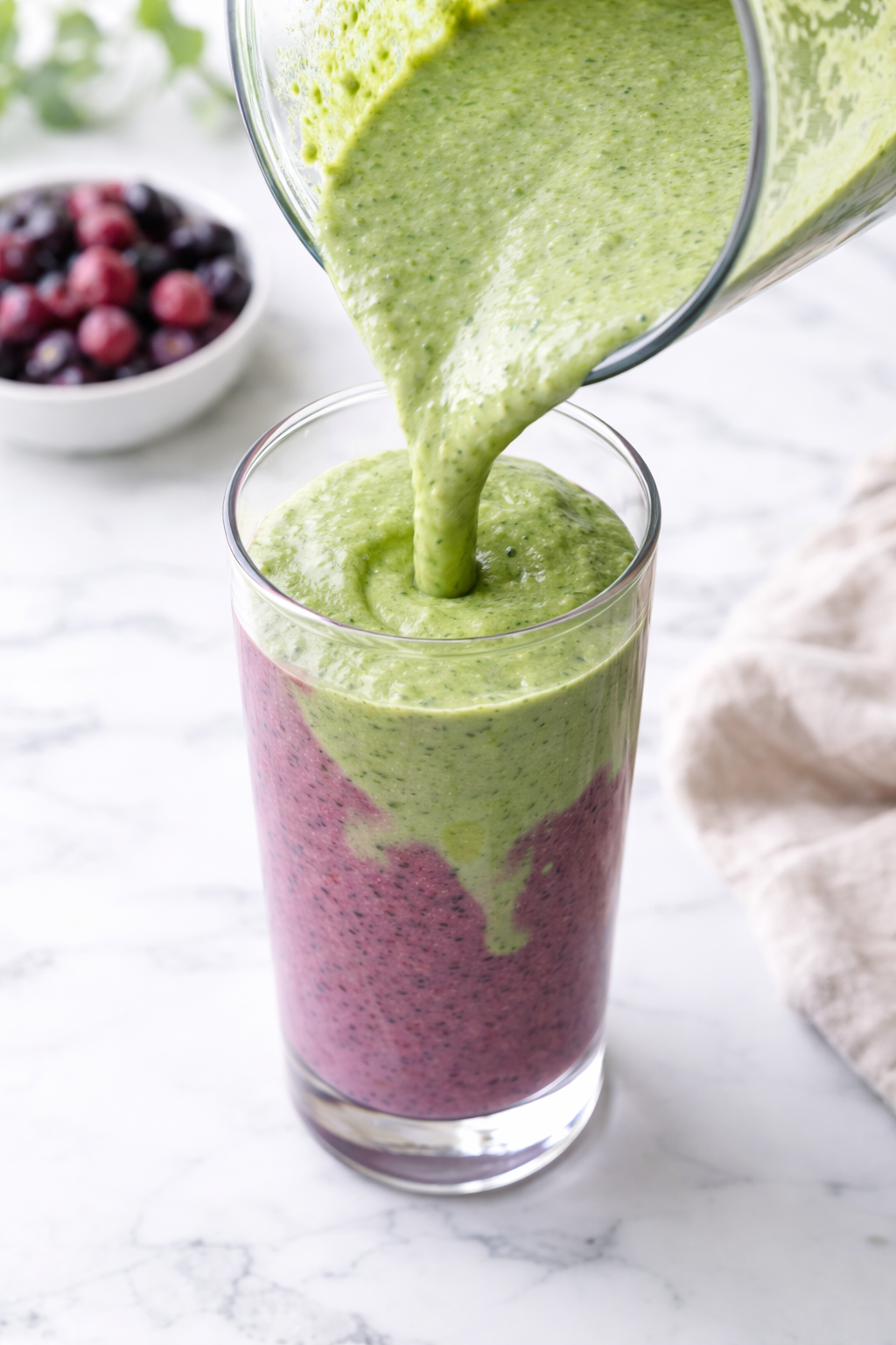 Slowly pour the matcha mixture over the berry smoothie.
