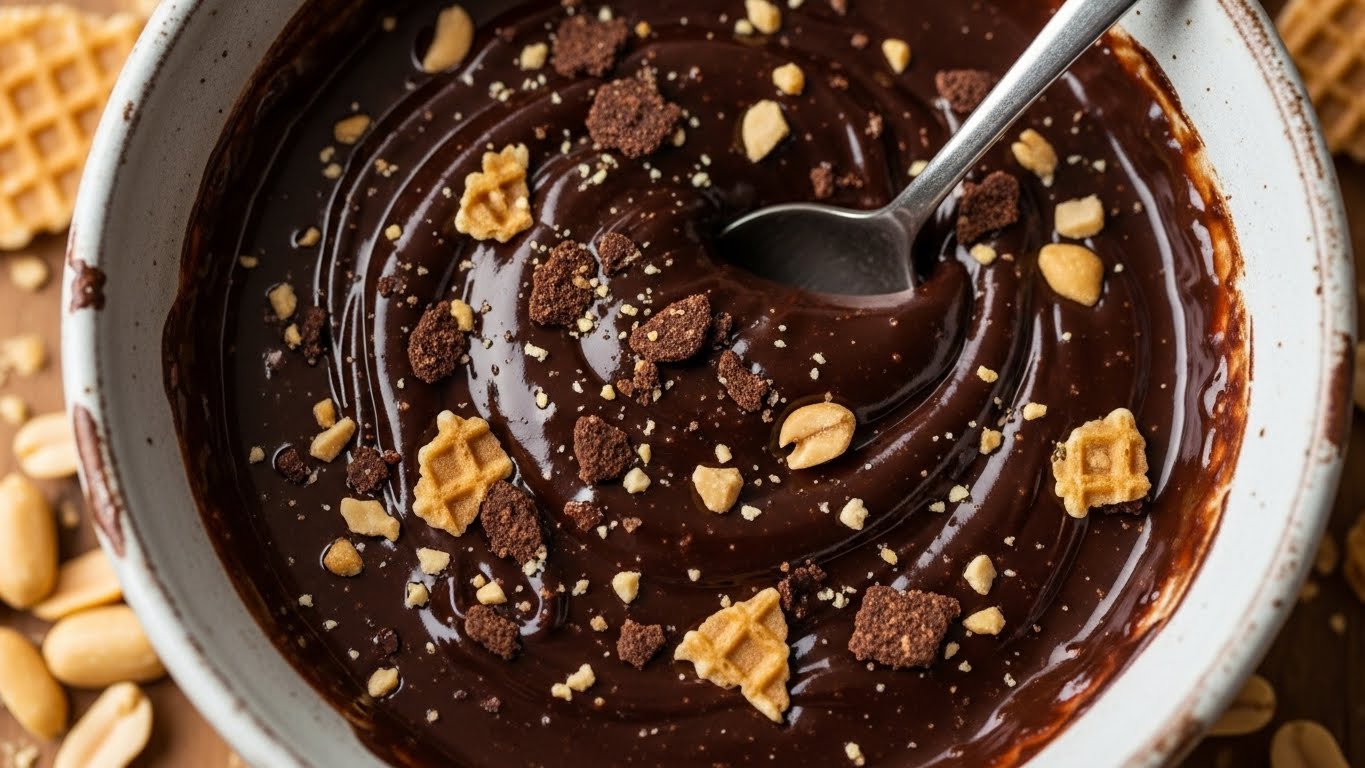 Melt the dark chocolate chips with coconut oil until smooth, then stir in crushed waffle cones and chopped peanuts.
