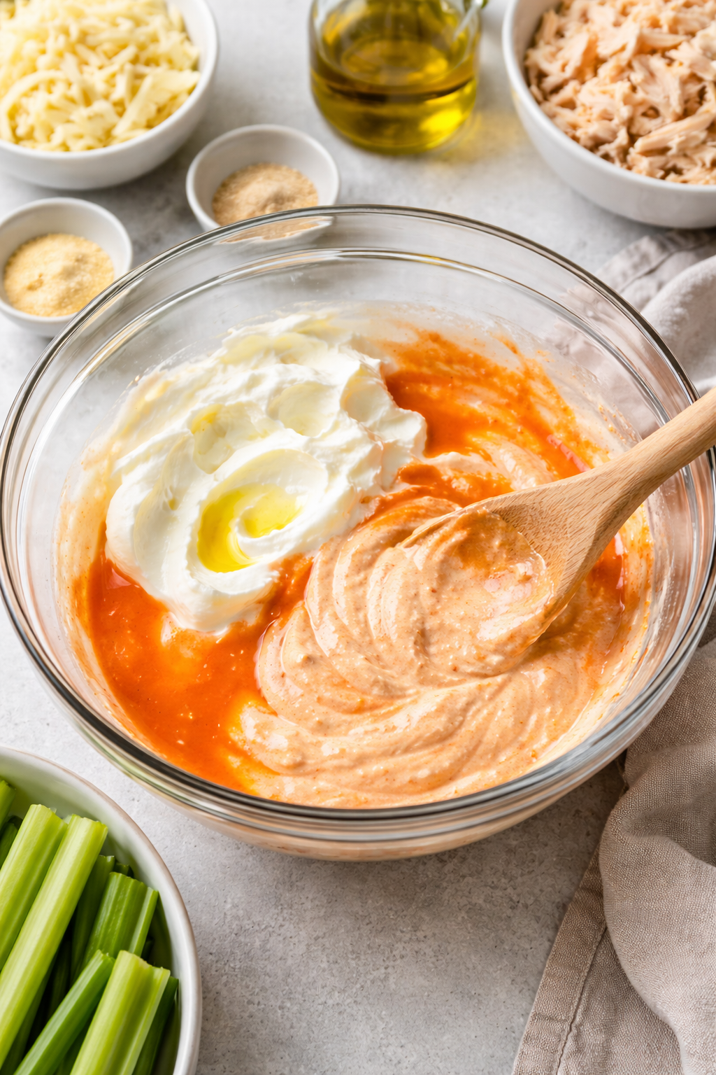 In a large bowl, combine Greek yogurt, light cream cheese, buffalo sauce, and olive oil until smooth.