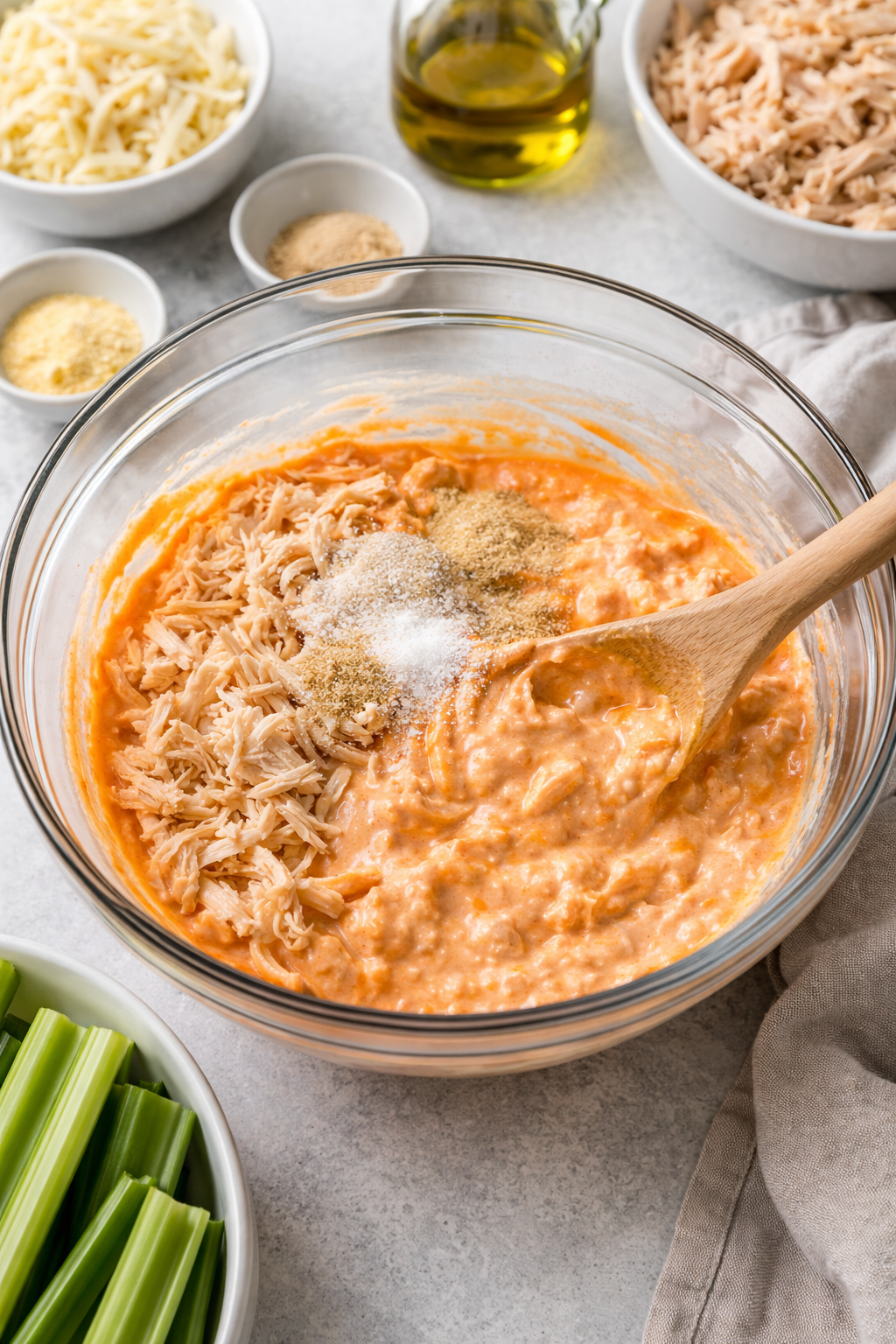 Stir in shredded chicken, garlic powder, onion powder, and salt until evenly mixed.
