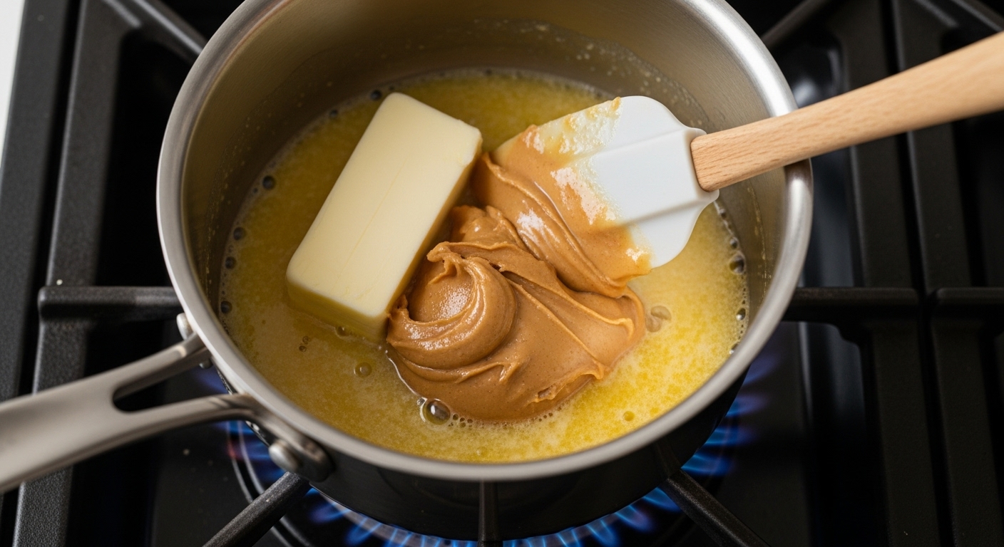 In a saucepan over low heat, melt the butter and peanut butter together, stirring until smooth.