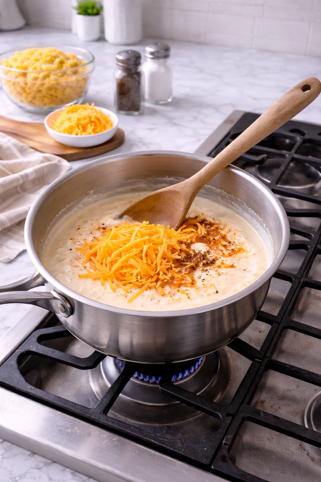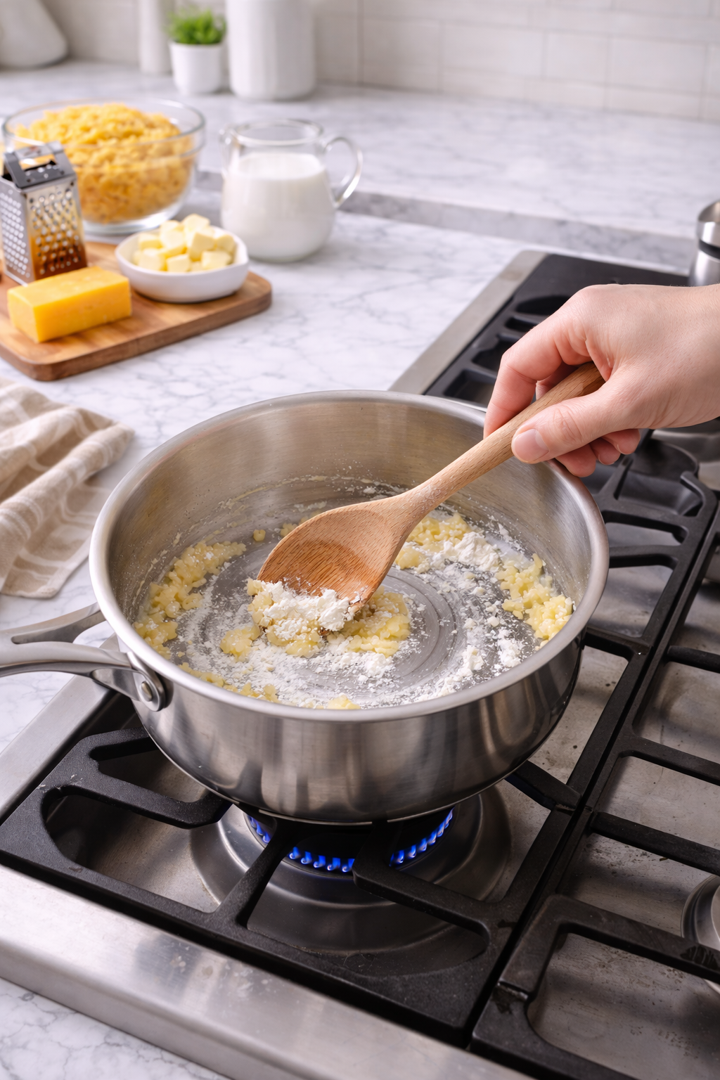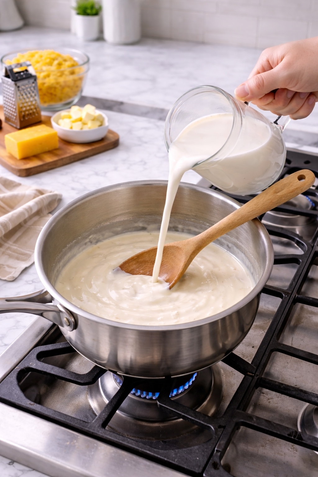 Slowly pour in milk while whisking until the sauce thickens into a creamy texture.