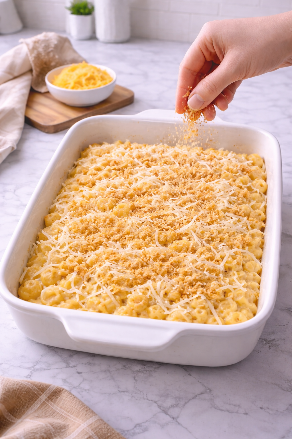 Transfer the mixture into the baking dish, sprinkle mozzarella and bread crumbs on top, then bake for 25–30 minutes until golden and bubbly.