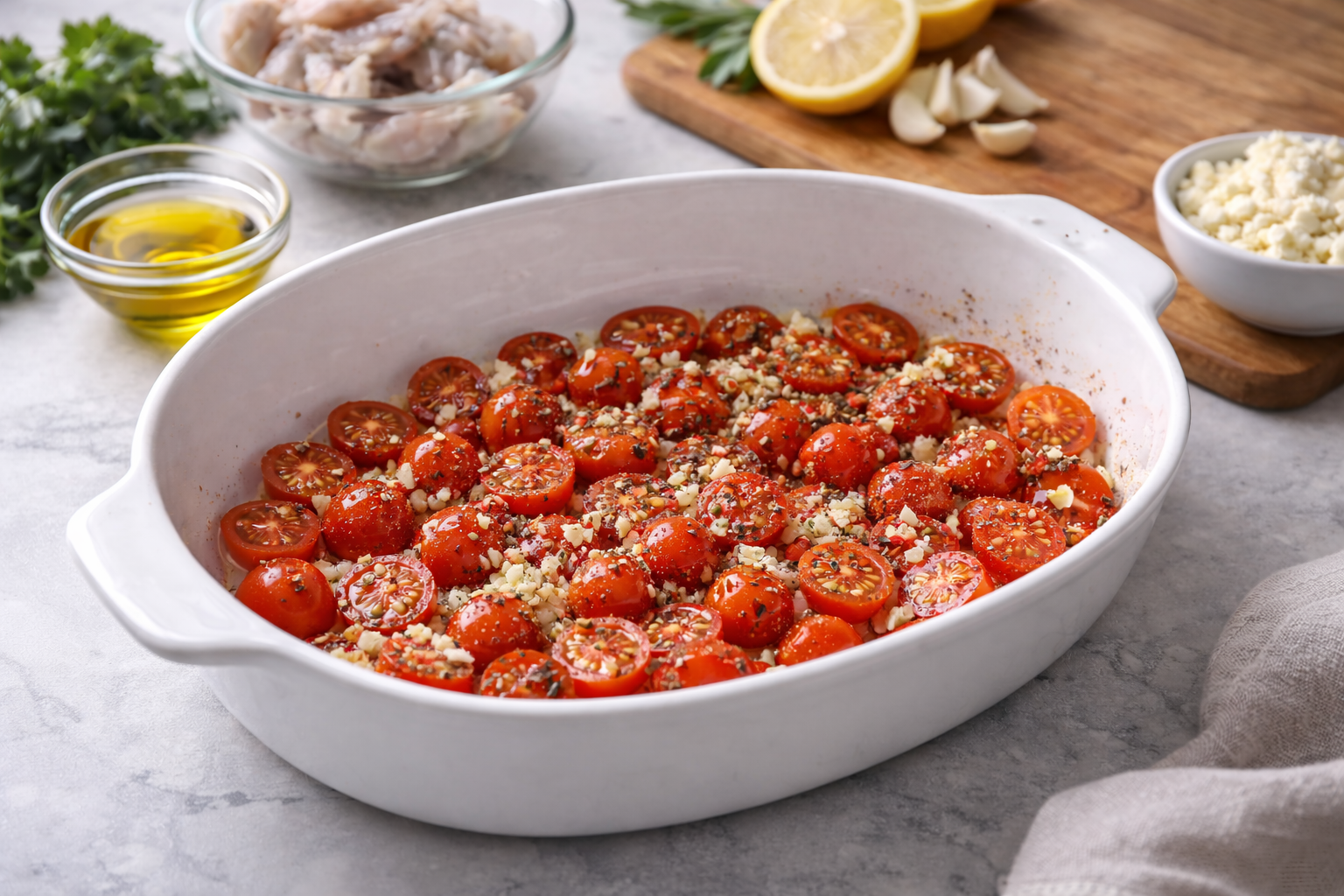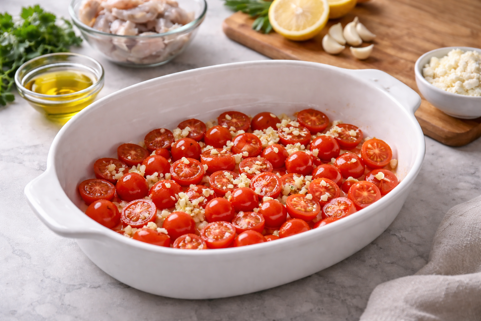 Spread the cherry tomatoes and minced garlic evenly in the dish, then drizzle with olive oil.
