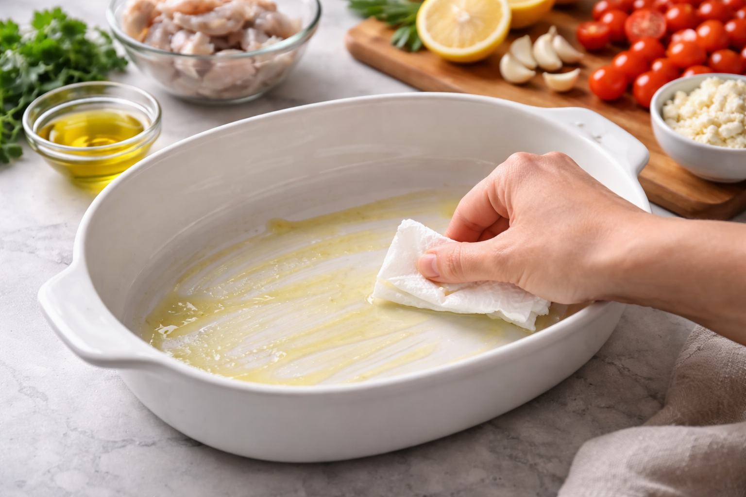 Preheat the oven to 200 C and lightly grease a baking dish with olive oil.