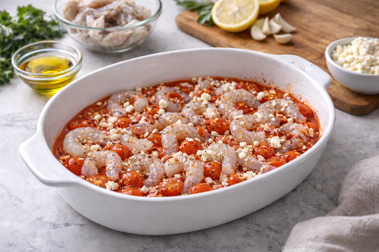 Spoon tomato sauce around the shrimp and scatter the crumbled or shredded cheese evenly over everything.