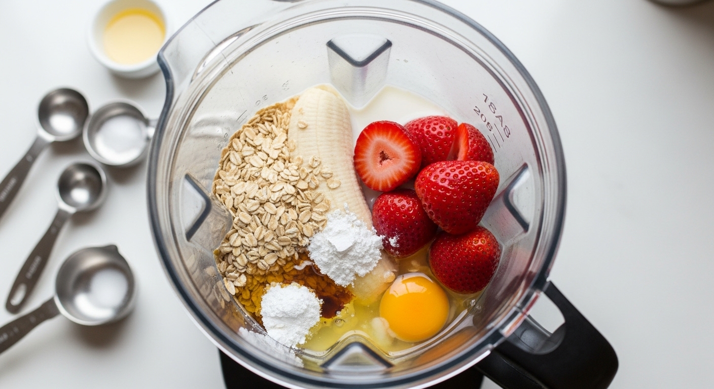 Add oats, banana, strawberries, milk, egg, baking powder, vanilla, honey, and salt to a blender.