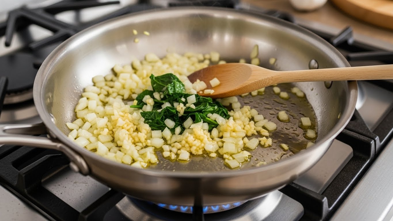 Heat olive oil in a pan over medium heat, sauté the onion and garlic until soft and fragrant. Add spinach and cook until wilted, then remove from heat and let cool slightly.