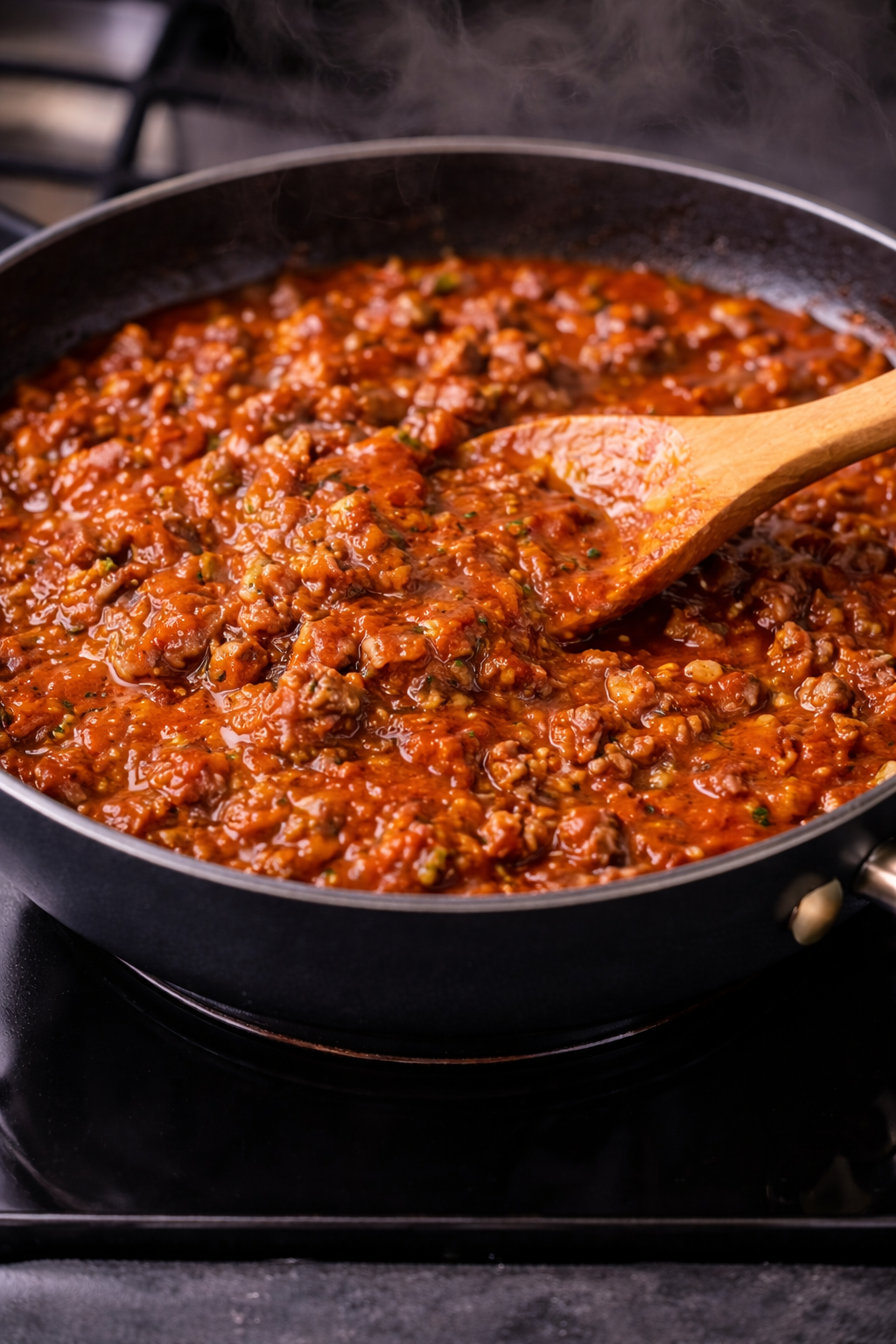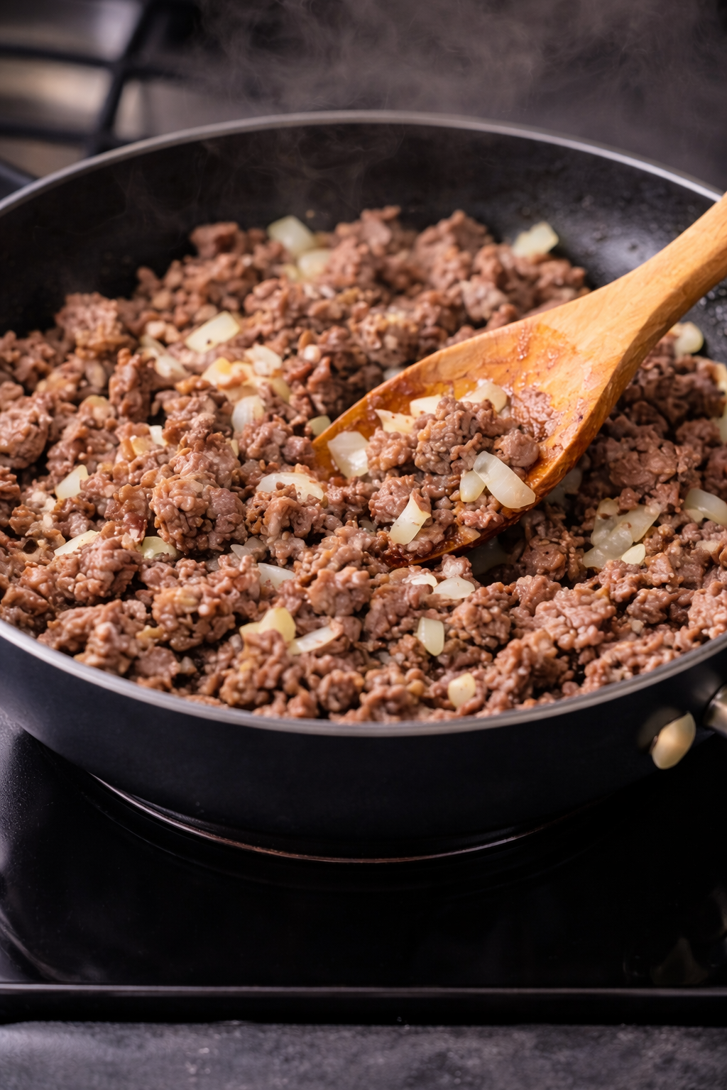 Heat olive oil in a large pan over medium heat. Sauté the onion and garlic until soft, then add ground beef and cook until browned.